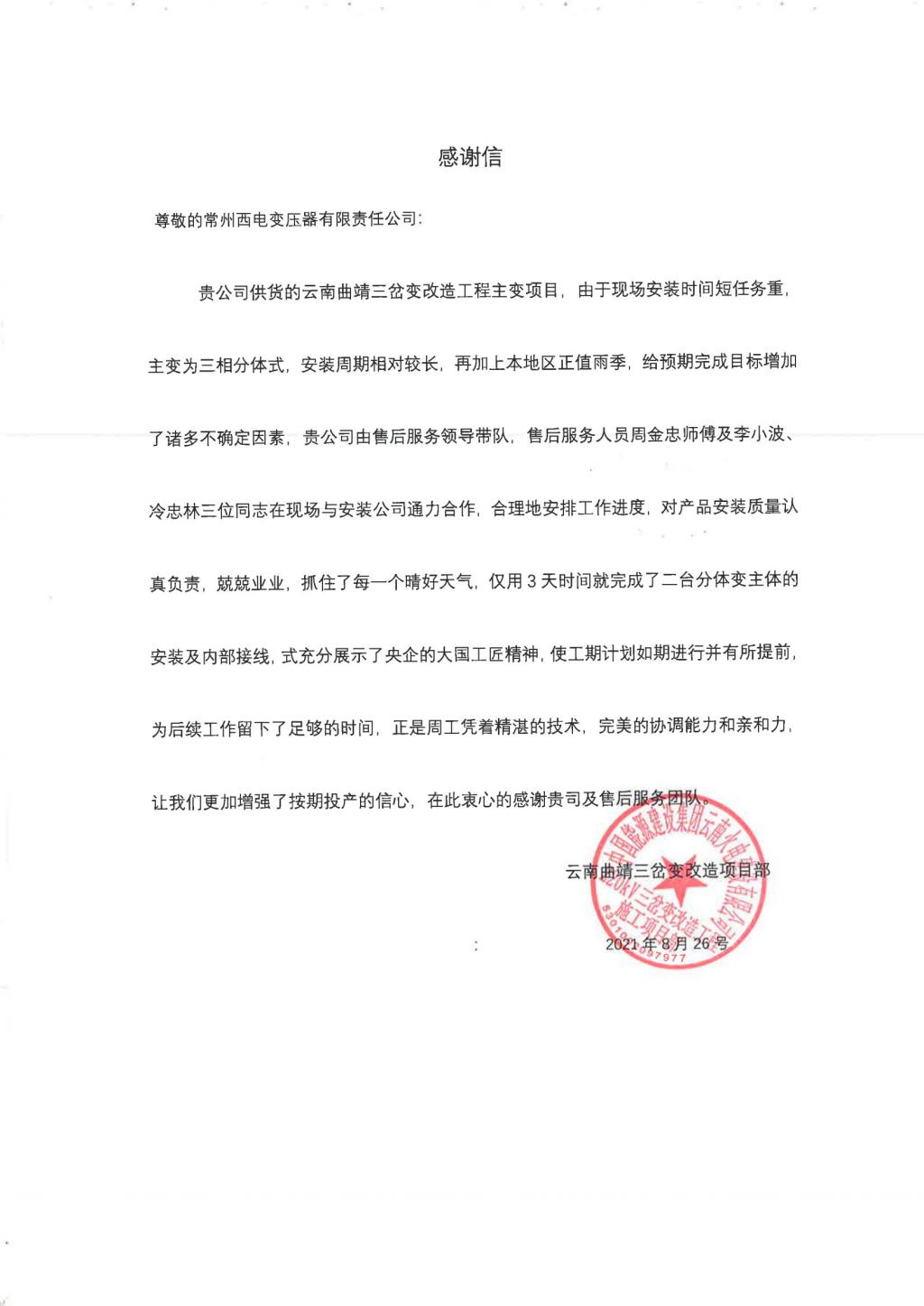 日前,西电常变收到云南曲靖三岔变改造项目部发来的感谢信,对公司售后服务工作提出表扬,感谢公司精准、高效、到位的服务。