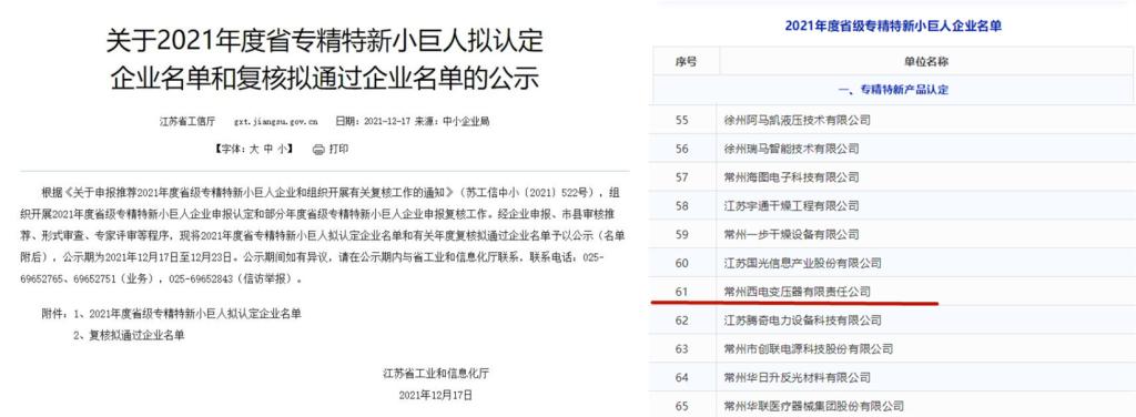 近日,江苏省工业和信息化局公布2021年度省专精特新小巨人企业和产品认定名单,西电常变榜上有名,公司生产的超(特)高压变压器,经过企业申报、地方审核、形式审查、专家评审等程序认定为“江苏省专精特新产品”。