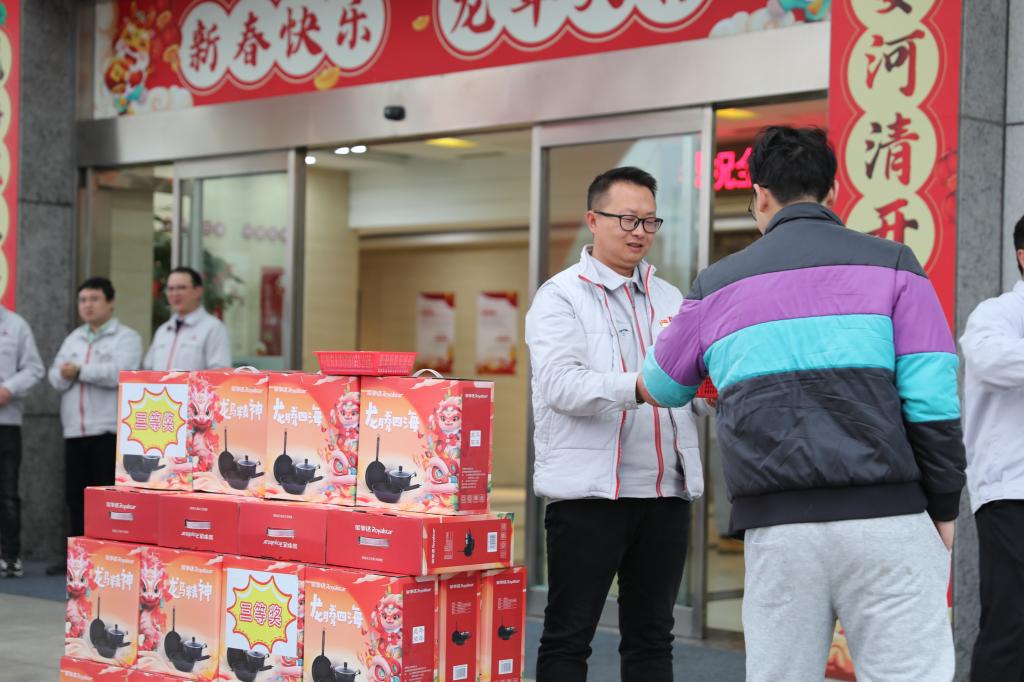 广场上,抽到心仪奖券的员工,脸上洋溢着幸福的微笑,期待着福运满满、龙行大运!上午11点,职工培训中心人头攒动、热闹非凡。在大家热情的掌声和期待的目光中,新春大吉送祝福抽奖活动正式开启。随着电脑大屏幕滚动跳跃的字符,所有奖项依次产生,特等奖最为激动人心,一阵欢呼雀跃之后,获奖者依次合影留念。