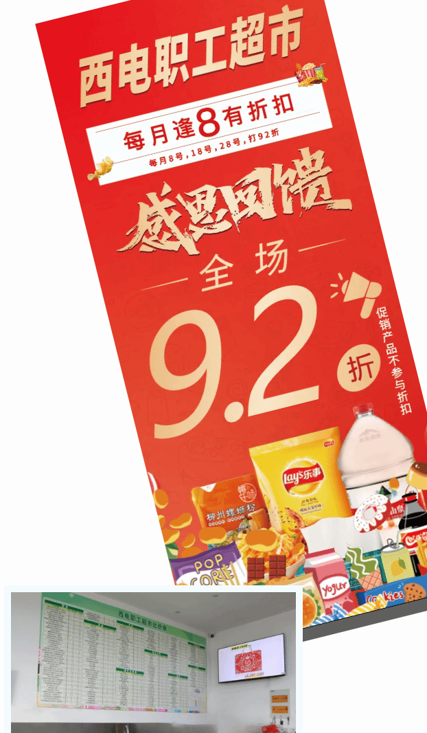 每月逢“8”(8号、18号、28号)还有全场9.2折。超市商品价格对标大润发超市,确保价格不高于大润发同期售价,并通过展板上墙公示。购物满200、300元还有礼品相赠,精打细算过日子,幸福感满满!